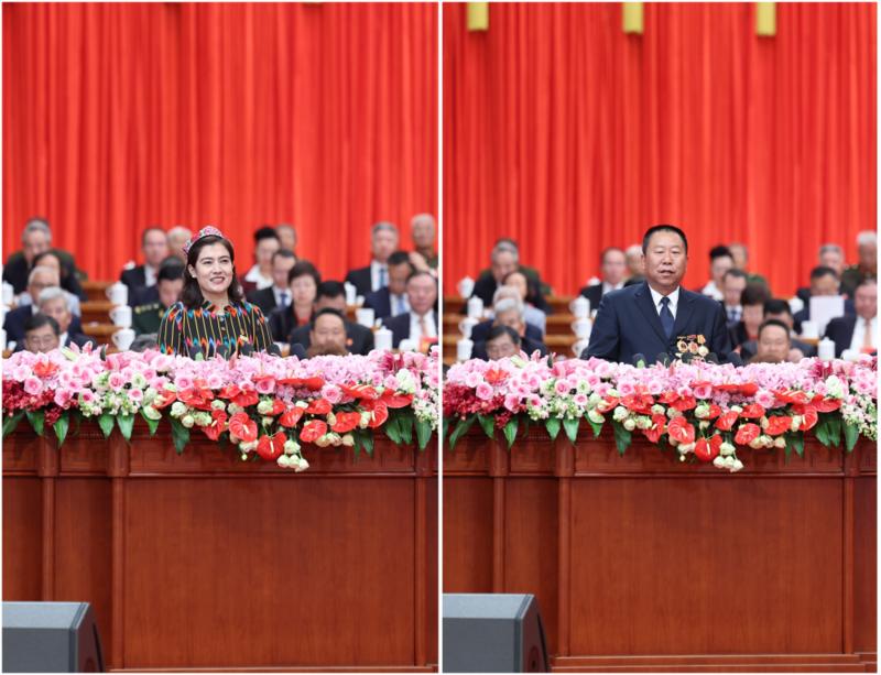 主席台上,四位模范见证着这一荣光时刻。23日受到接见的魏德友、买买提江·吾买尔、巴依卡·凯力迪别克、布茹玛汗·毛勒朵,也受邀参加庆祝大会。与庄严的国徽同框,他们深深为祖国的繁荣富强与自治区发展的光辉历程而自豪。