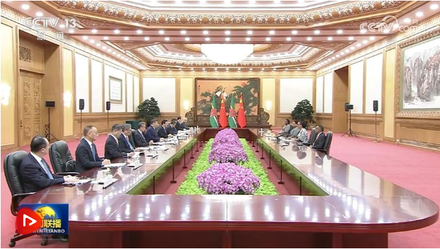 10月14日上午,国家主席习近平在北京人民大会堂会见来华出席全球妇女峰会的多米尼克总统伯顿。