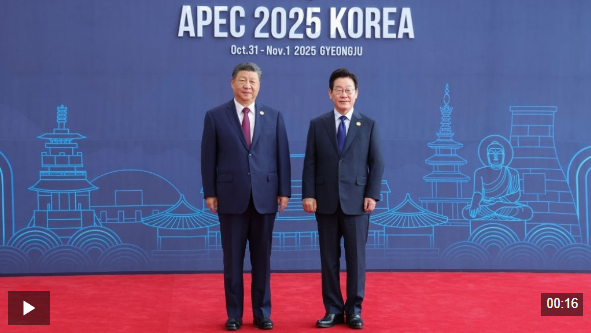 央视新闻讯 当地时间10月31日上午,亚太经合组织第三十二次领导人非正式会议第一阶段会议在韩国庆州和白会议中心举行。习近平抵达会场时,韩国总统李在明热情迎接,两国元首握手合影。