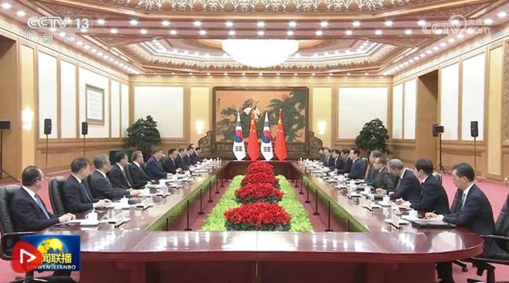 习近平指出,当前世界百年变局加速演进,国际形势更加变乱交织。中韩在维护地区和平、促进全球发展方面肩负重要责任,有广泛利益交集,应当坚定站在历史正确一边,作出正确战略选择。80多年前,中韩两国付出巨大民族牺牲,赢得抗击日本军国主义的胜利。今天更应携手捍卫二战胜利成果,守护东北亚和平稳定。作为经济全球化的受益者,中韩要共同反对保护主义,践行真正的多边主义,为推进平等有序的世界多极化、普惠包容的经济全球化作出贡献。