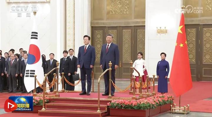 会谈前,习近平和夫人彭丽媛在人民大会堂北大厅为李在明和夫人金惠景举行欢迎仪式。