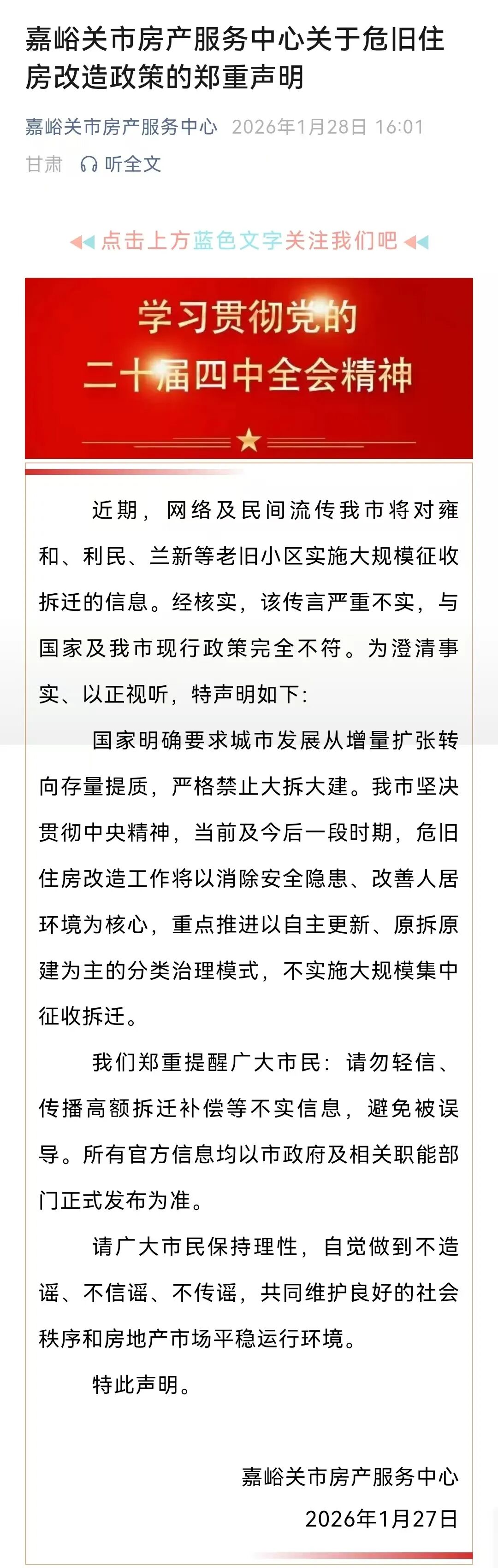 2026年1月27日,甘肃省嘉峪关市房产服务中心发布《嘉峪关市房产服务中心关于危旧住房改造政策的郑重声明》,全文如下: