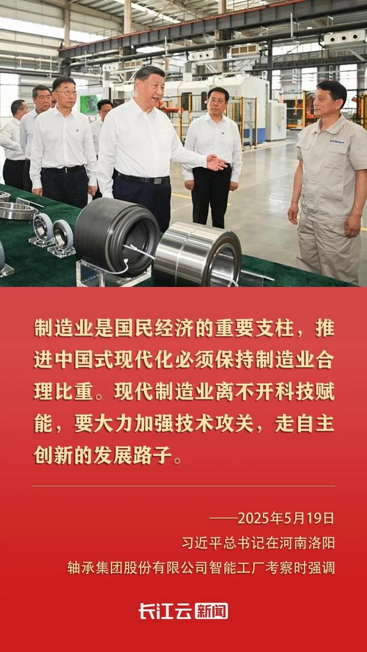 2025年5月,习近平总书记来到河南考察,在洛阳轴承集团股份有限公司,他鼓励大家:“我们坚持发展实业,从过去洋火、洋皂、洋铁等靠买进来,到现在成为工业门类最齐全的世界制造业第一大国,这条路走对了。”