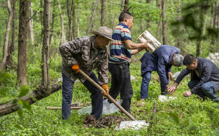 2025年4月16日,江西新余,仙女湖区河下镇花园村林场,人们正在搬运、栽植灵芝菌棒。