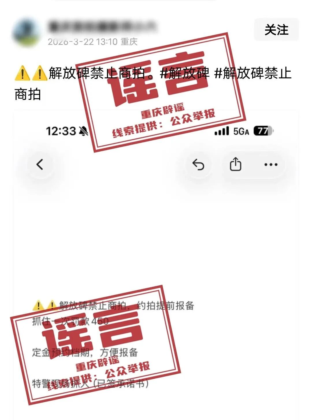 近日,网民李某在互联网平台发布信息称“解放碑禁止商拍 特警现场抓人”,引发关注。经核实,网传信息系谣言。目前,网民李某已被警方依法查处,不实信息已删除。
