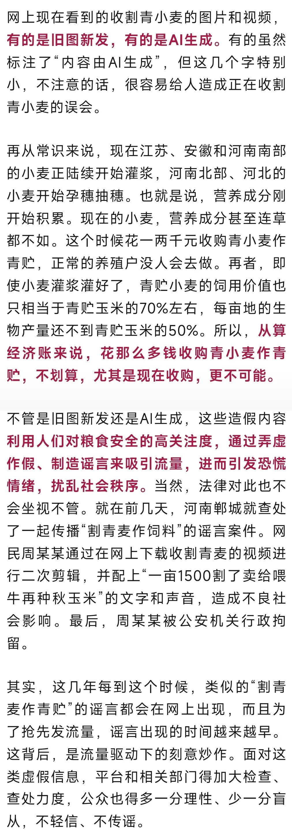 从4月初开始,网上陆续出现了一些短文和视频,说好好的小麦被割去作青贮饲料了,一亩小麦给1500元到2000元,并且有“图”有“真相”。先说结论:这些都是假的,是谣言。