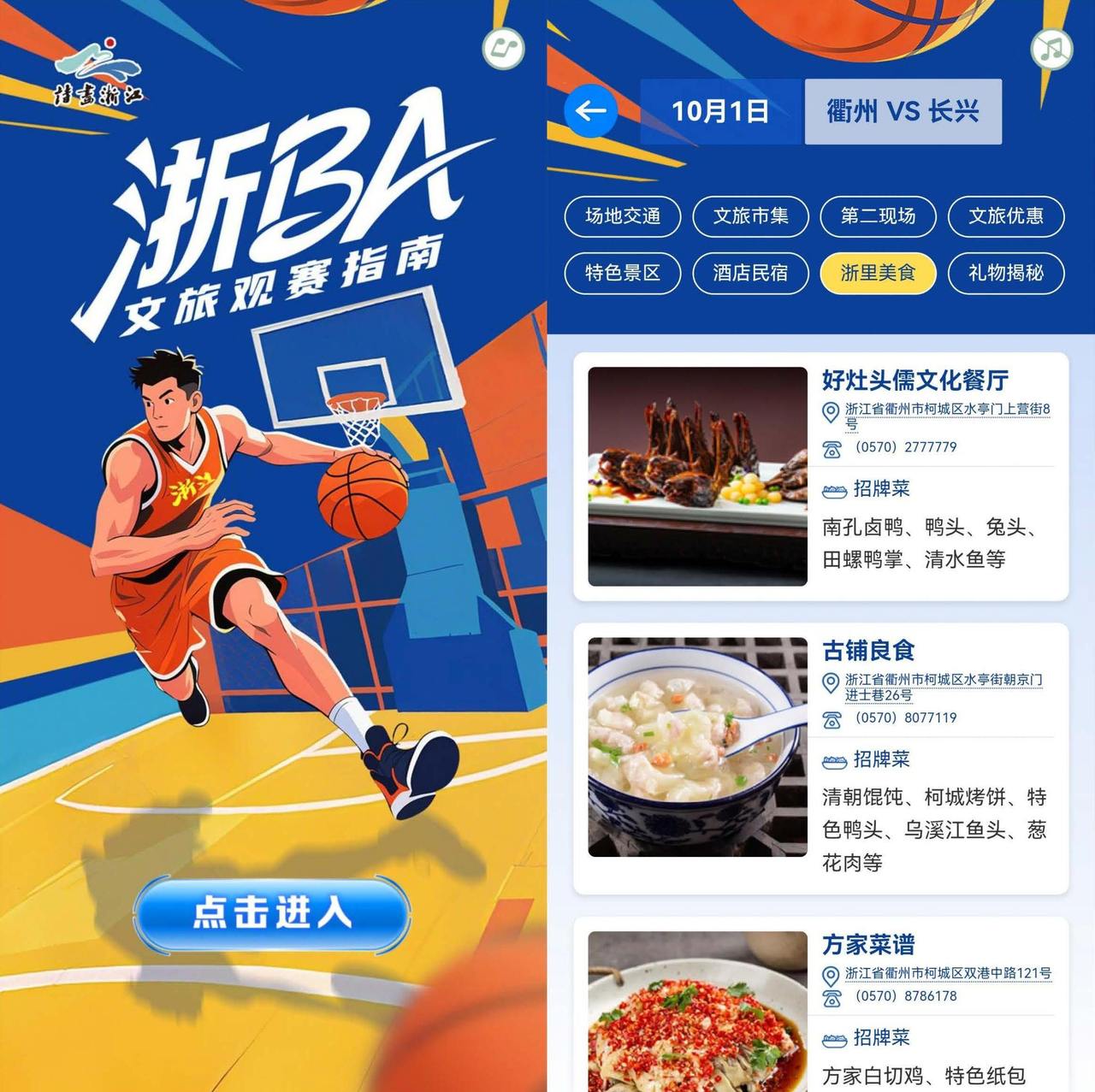 “浙BA”文旅观赛指南电子刊将整合当月“浙BA”最全赛程,点击查看每一场比赛,都能看到所在主场城市的场地交通、文旅市集、第二现场、文旅优惠、特色景区、酒店住宿、浙里美食、礼物揭秘等八大类别的实用信息。