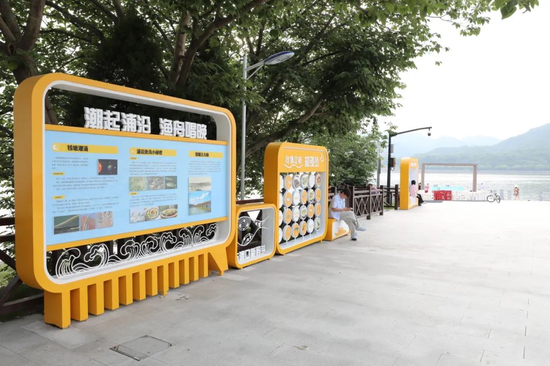 在这里,可以深入了解浦沿码头文化与围垦精神,新增的3处“城市之窗”文化节点趣味十足:互动翻翻牌带你认识钱塘鱼类、了解渔业知识、学习特色菜肴做法;展板则细数浦沿渔业发展历程与大事记;更有“潮涌钱塘 诗画浦沿”互动展板,精选浦沿古诗词,打造一个“可触摸的历史”沉浸空间。