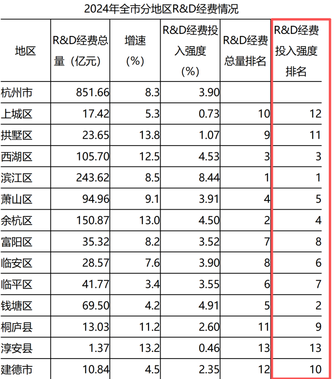 近日,杭州2024年科技经费投入强度指标:R&D经费投入强度(R&D经费与GDP之比)出炉。2024年,滨江区研究与试验发展(R&D)经费243.62亿元,比上年增长8.5%;R&D经费投入强度为8.44%,位居全市第一。