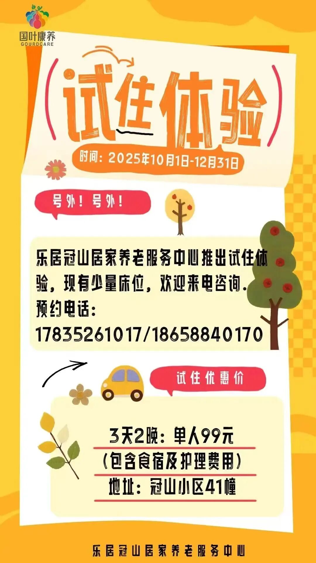 凡达到法定退休年龄的长者可在今年年底(2025年12月31日)前参加乐居冠山居家养老服务中心的3天2晚试入住活动。长者需携带个人洗护用品、日常用药、换洗衣物。如有本年度的体检报告或出院小结也可携带。