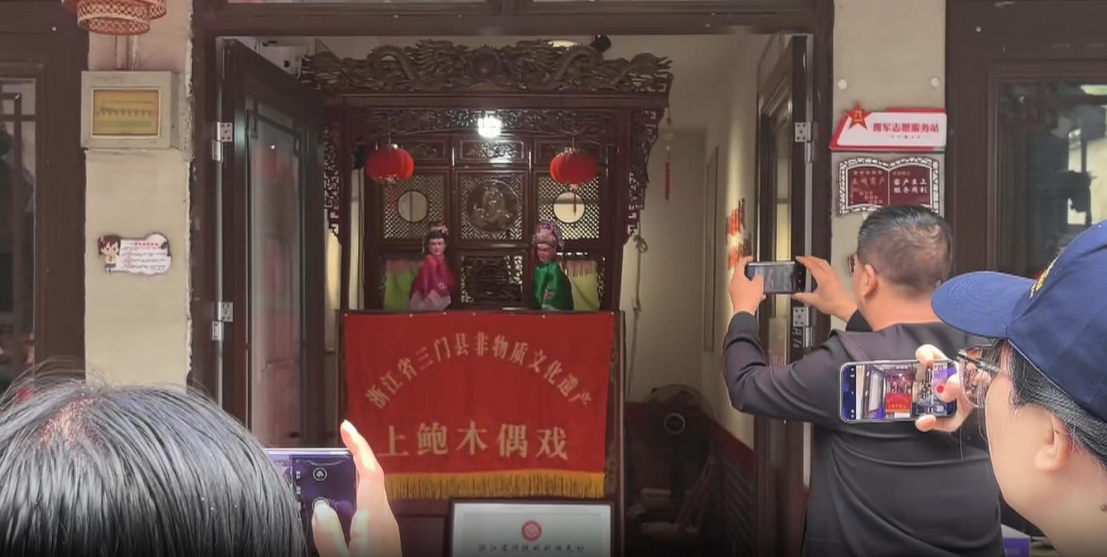 在台州亭旁红色老街,另一番非遗热闹正在上演。木雕舞台上,身着精致戏服的木偶在鲍师傅的操控下,或挥袖转身,或随越剧唱腔摆动,台下游客举着手机记录,不时跟着唱腔轻和。