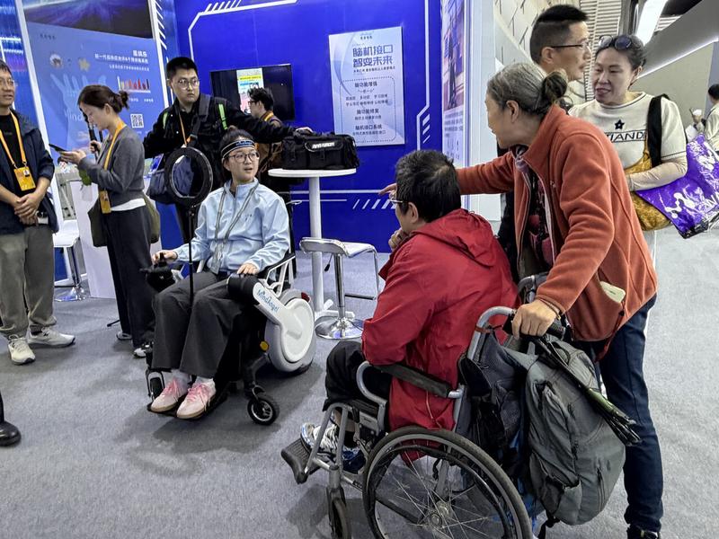 在A馆的杭州曼安智能科技有限公司展位前,韩阿姨推着儿子的轮椅,全神贯注地观看着一场“不可思议”的演示——工作人员坐在电动轮椅上,全程未动用手柄或任何人力,仅凭“思想”自如地控制轮椅前进、转弯,众多围观者皆惊叹不已。