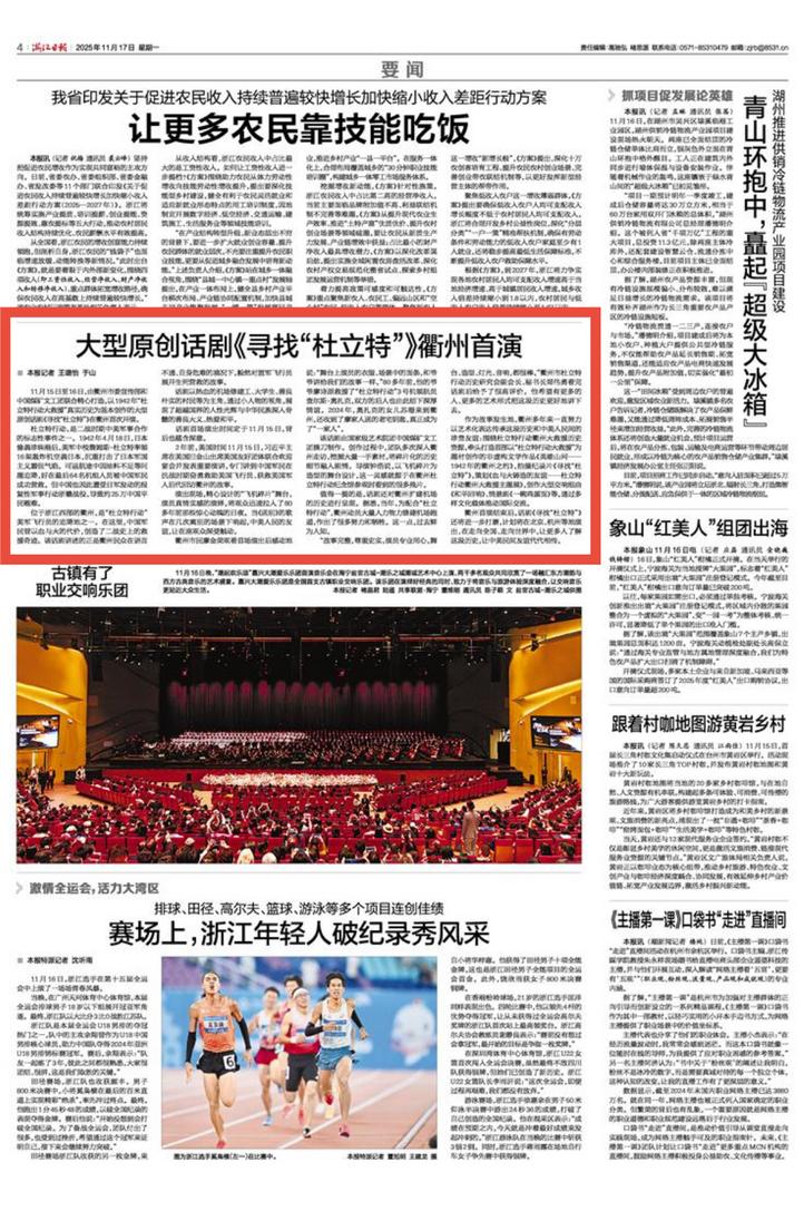 11月15日至16日,由衢州市委宣传部和中国煤矿文工团联合精心打造,以1942年“杜立特行动大救援”真实历史为蓝本创作的大型原创话剧《寻找“杜立特”》在衢州首次开演。