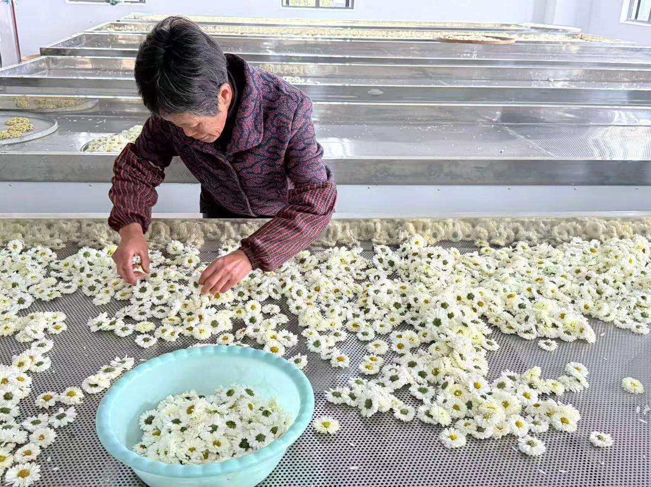 金山村的共富工坊内,工人正分拣杭白菊 记者 汪雨晨 摄