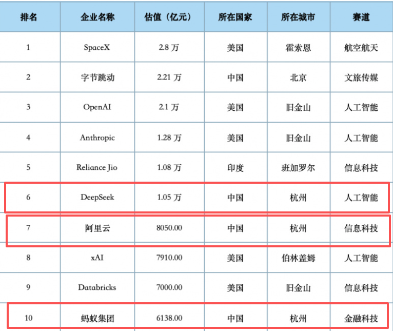 潮新闻讯 据央视新闻报道,近日,2025全球独角兽企业500强榜单发布,我国共有150家企业上榜,在数量和估值占比上继续保持全球领先。在这份彰显国家创新实力的榜单中,浙江表现尤为亮眼,全球估值前十企业中,中国占4席,浙江独揽3席:DeepSeek、阿里云、蚂蚁集团如三颗新星,刷新“创新浙江”的天际线。