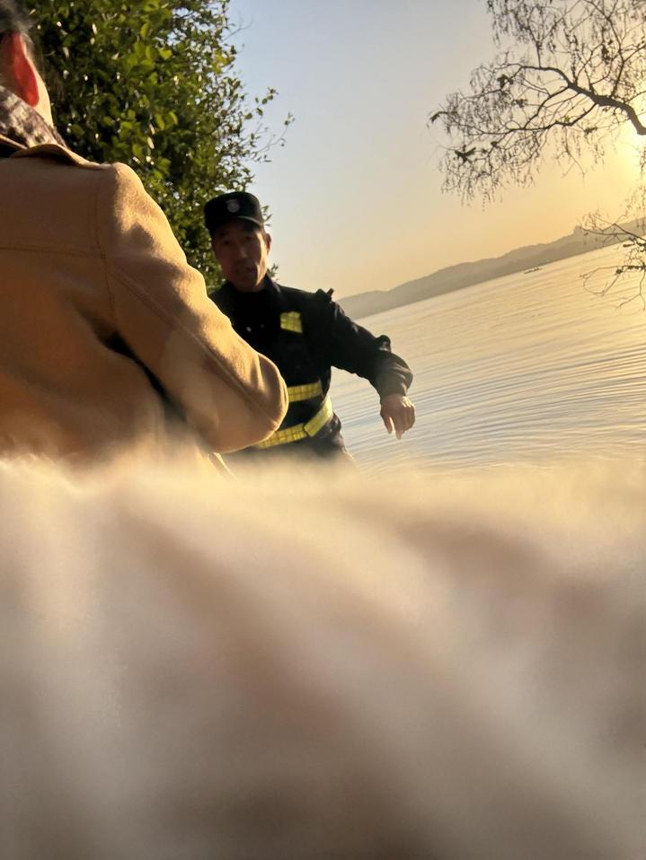 “我刚在西湖边看完日出,正在星巴克喝咖啡,看到保安带着一个全身湿透的女孩进来,应该是掉进西湖了。”小易说,自己是北京邮电大学的大四学生,即将去实习,趁着周末有空,特地来西湖边逛逛。“她头发都湿透了,确实有点狼狈。大家纷纷帮忙递纸巾、找毛毯。”小易没有犹豫,主动留下来陪伴她,直到把她送上车后才离开。