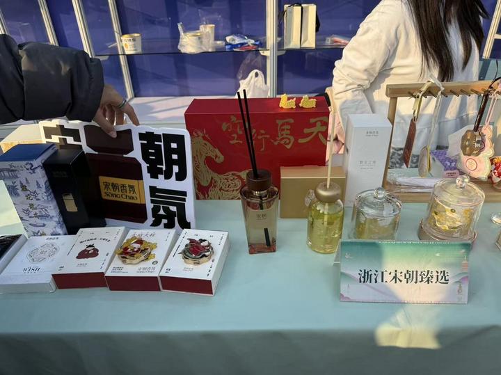 沿着展位向前,一股清雅香气将人引向宋朝香氛展位。这里陈列着各式香囊、挂饰及文创香氛,大多融入国潮纹样或俏皮的卡通形象。“我们很多产品支持定制,比如这款香氛设计了Q版苏东坡形象,让传统文化更活泼、贴近年轻人审美。”展位负责人王倩说,这些既承古韵,又具新意的产品,正为年礼带来一份别致的诗意。
