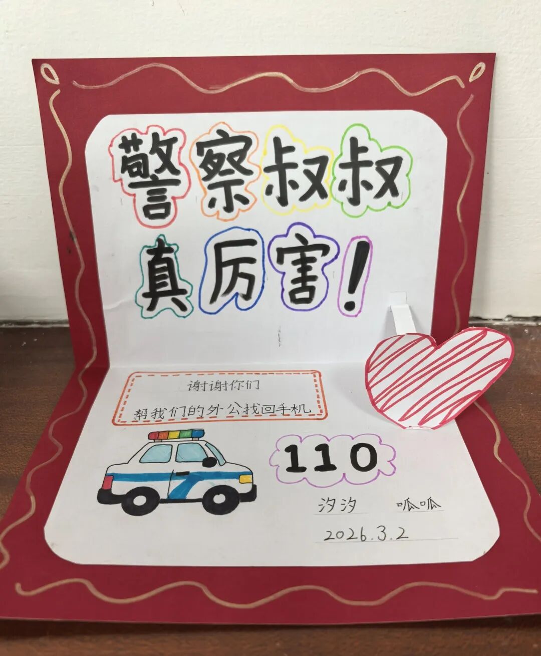 贺卡上画着一辆警车,还有稚嫩的笔迹工整地写着“警察叔叔真厉害”“谢谢你们”。姐姐汐汐和妹妹呱呱仰着小脸说:“谢谢警察叔叔,让外公笑了!”