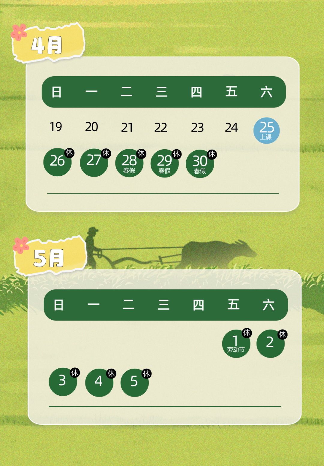 春假4月28日至30日,5月1日-5日为法定劳动节假期,4月25日(星期六)上课,4月27日(星期一)休息。