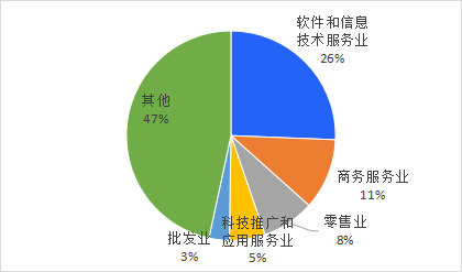 消费投诉排名前五的行业为软件和信息技术服务业、商务服务业、零售业、科技推广和应用服务业、批发业,分别占比为26%、11%、8%、5%、3%。
