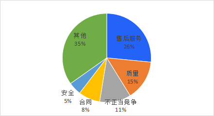 从投诉问题类别来看,投诉量较多的问题主要有售后服务、质量、不正当竞争、合同、安全,合计占比65%。