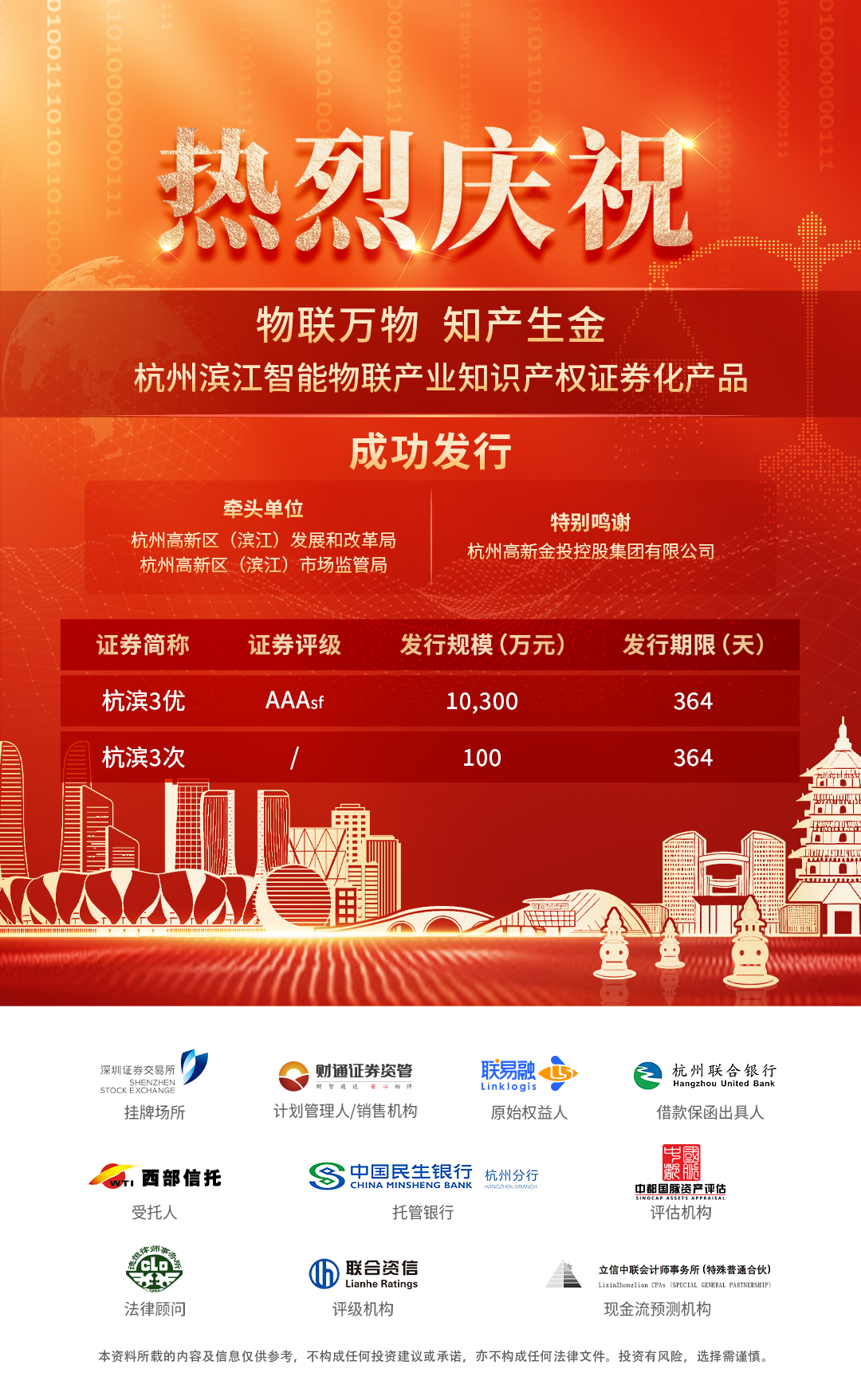 3月17日,“财通-杭州滨江知识产权第3期资产支持专项计划(科技创新)”在深交所挂牌发行,该产品是首个以智能物联产业为主题的知识产权证券化产品,标志着高新区(滨江)在深化知识产权金融创新、服务重点产业链高质量发展方面迈出关键一步。