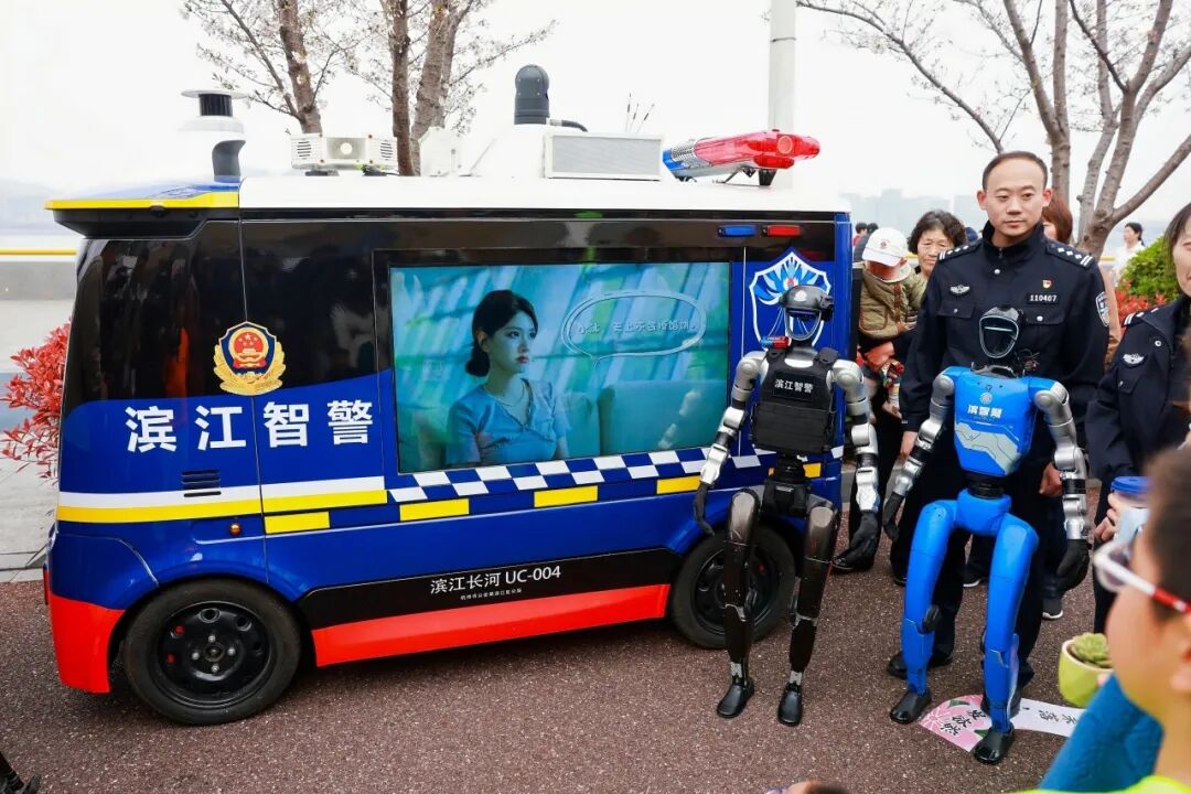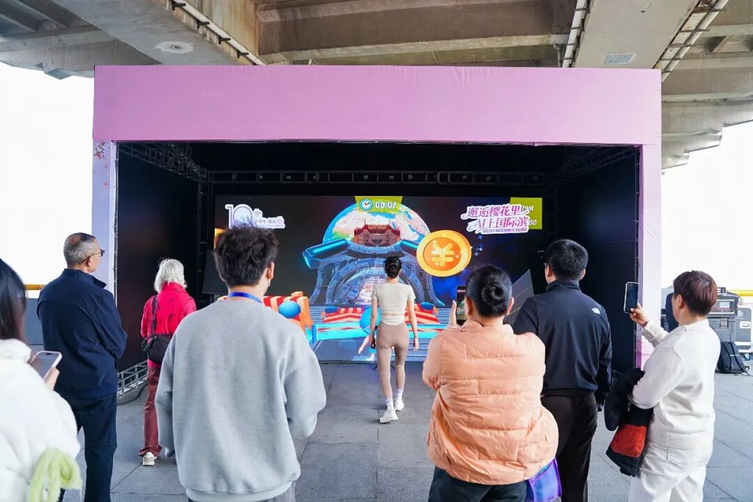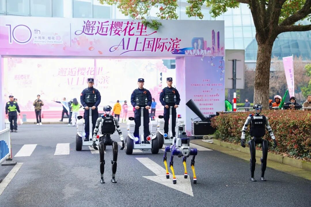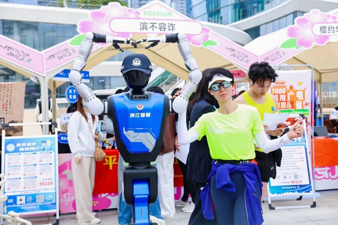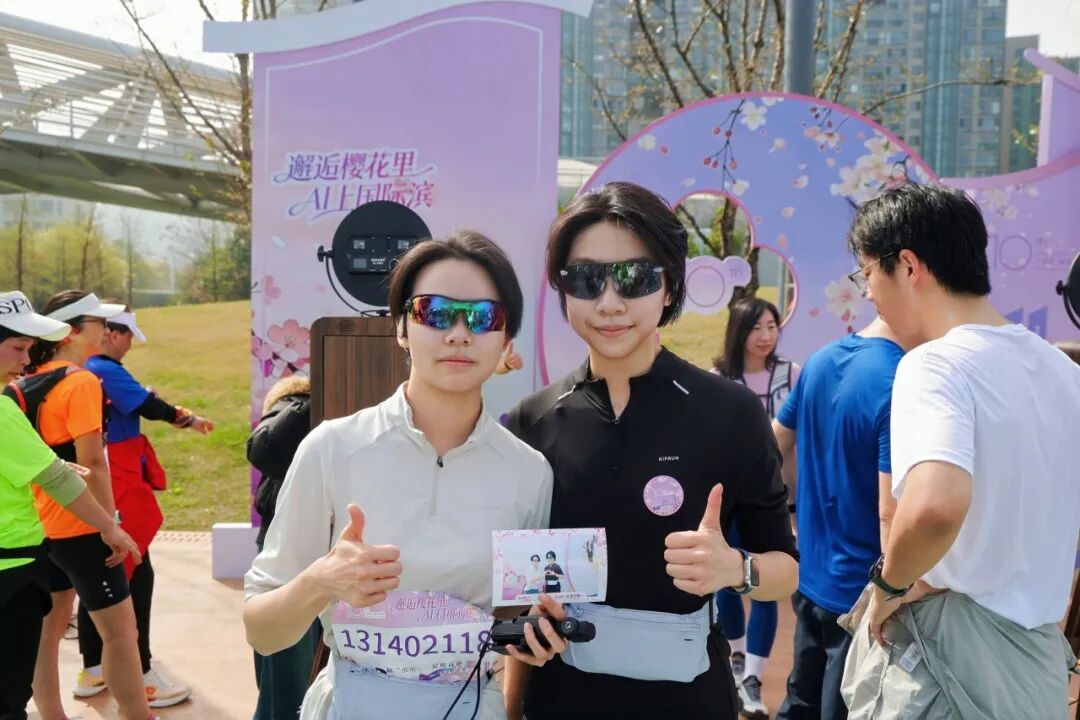 科技感依旧是“樱花跑”的鲜明底色。赛道上,“滨江智警”方阵中,“滨小新”机器人、机器狗、无人机、无人车全程伴随巡护,构建起立体化、智能化的平安赛道。互动区内,“樱AI而聚”专区打破虚实边界,跑者仅凭肢体动作,便可在虚拟霓虹赛道上体验1:1沉浸式竞速,解锁“二次元奔跑”的新奇感受。戴上AR眼镜,跑者于电视屏前点亮虚拟樱花树上的专属花瓣,共同绘就一棵“十周年纪念樱”。智能伙伴“滨滨”搭载AI交互系统,化身“会聊天的朋友”,与跑者实时互动。“AR眼镜让‘樱花跑’更浪漫了。”一位跑者兴奋地说。