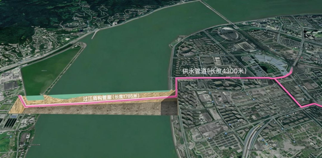 九溪水厂过江通道项目总投资约3.19亿元,设计常规供水规模10万立方米/日,应急状态下最大输水规模可达到30万立方米/日。工程采用非开挖的方式,新建1785米过江盾构管廊+4300米供水管道,管道自九溪水厂出厂管引出后,自西向东下穿珊瑚沙水库、钱塘江江底,抵达闻涛路与连江街交叉口的接收井。随后,再沿东信大道、和畅路、滨文路敷设管道,与滨江区现有主干管网精准衔接,形成完整的跨江输水体系,相当于为滨江新增一条“备用水脉”。